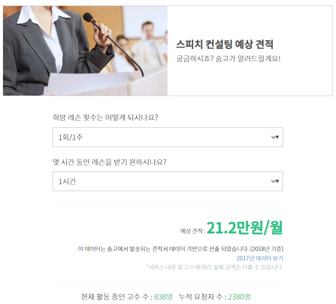 2018년 스피치 컨설팅 예상 평균 비용 : 21.1만 원/월 (주 1회, 1시간 기준)