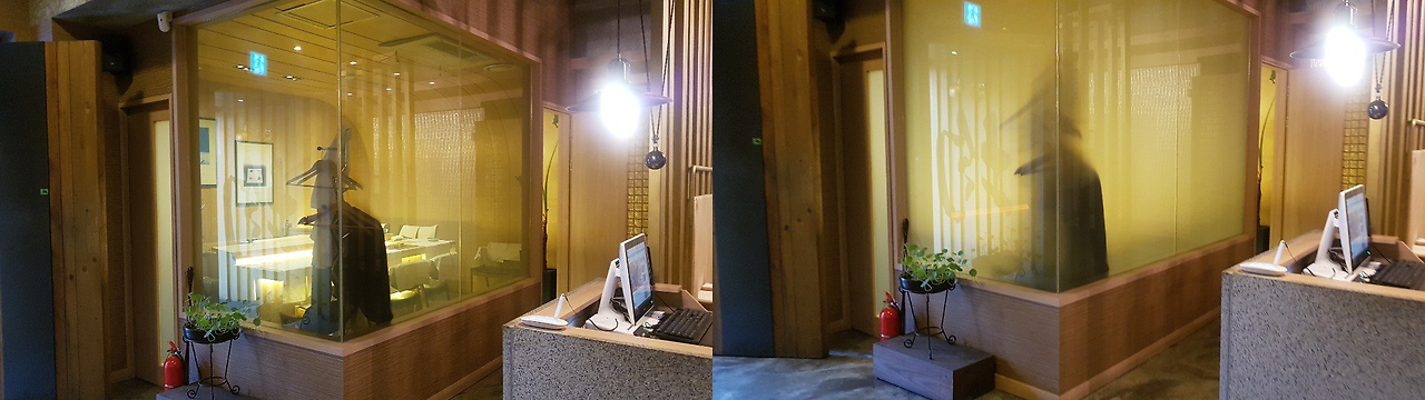 고급 일식집을 방문하시는 고객분들께서는 노출을 꺼려 하는 경우가 많더라고요. 그래서 그들의 프라이빗한 공간을 위해서 매직 유리라는 고단가 소재를 사용하여 마감을 하였죠.