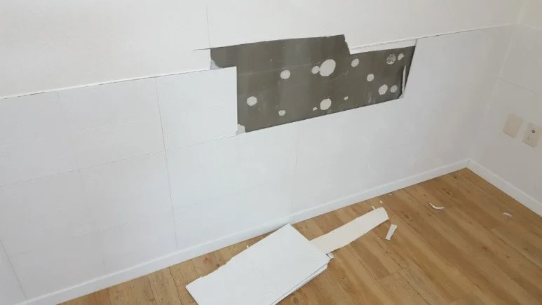 도배 시공을 위해서 기존의 있던 벽지를 탈착하는 작업을 먼저 진행합니다. 고객분의 방에는 특이하게 석고 타일이 시공되어 있었습니다. 석고 타일의 색상과 벽지 색상이 달라 기존 벽면이 불규칙한 모습이었죠. 기존의 벽지를 떼어내고 세정작업도 함께 진행 해야 합니다.