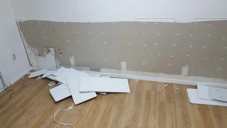 석고 타일을 접착시키기 위해 사용했던 접착제의 덩어리들이 뭉쳐서 벽마다 튀어나와 있었어요. 이를 공구로 제거하고 평평하게 만드는 게링작업(표면을 매끄럽게 하기 위해 이물질을 제거해주는 작업)을 진행했죠.