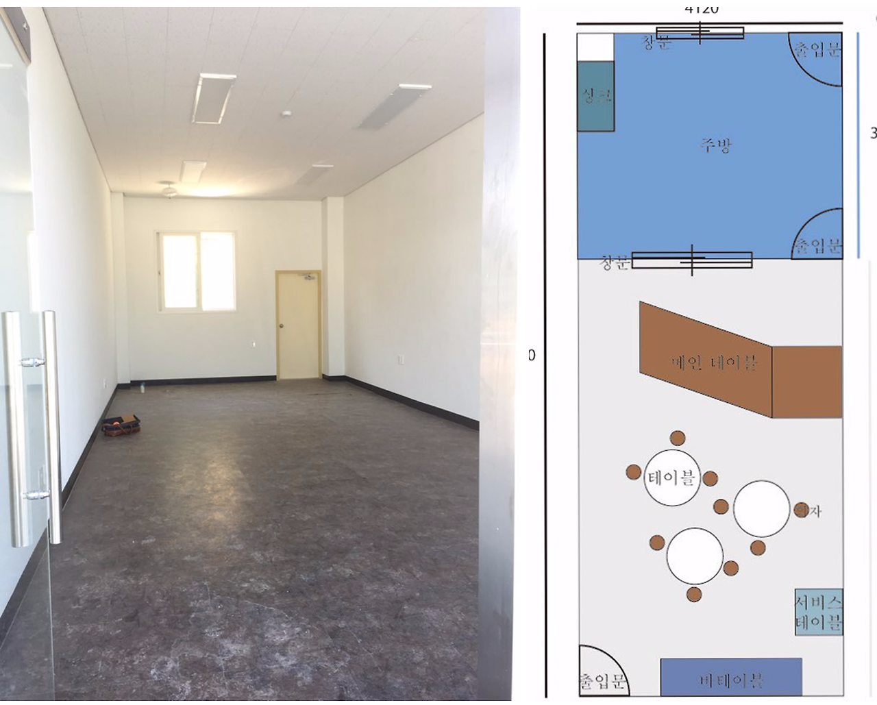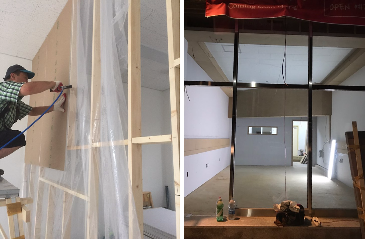 4. 시공 과정 : 실측 -> 디자인 작업 -> 목공사 -> 전기 배선 공사, 천장 흡음재 부착 -> 페인트 공사 -> 바닥 타일공사 -> 외부 데크 공사 -> 간판 공사 -> 내부 조명 디테일 작업