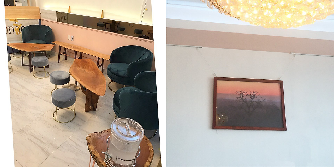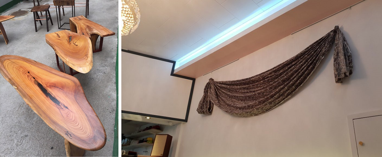 샹들리에도 기성품과 다른 스타일의 제품을 공수해왔어요. 손님들이 카페를 와서 사진을 찍으며 인테리어에 만족하길 원했죠. 고수님은 분위기의 걸맞게 우드 슬랩으로 직접 테이블을 제작했어요. 우드 슬랩으로 제작된 테이블은 기성품보다 훨씬 특색 있는 인테리어 요소가 되었죠.