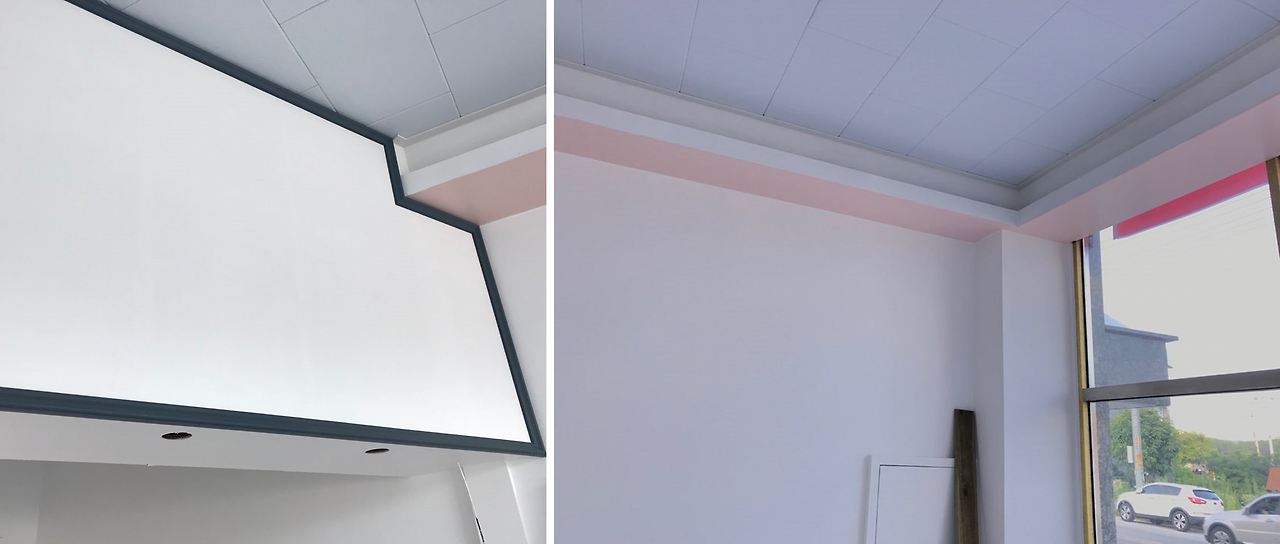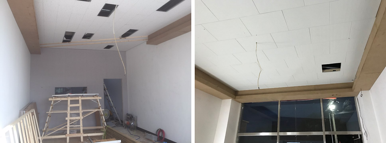 이 마카롱 카페에는 천장이 매우 높았어요. 그래서 스피커를 통해 음악을 틀게 되면 소리가 울리게 되죠. 장현민 고수님은 천장에 흡음판(소리를 흡수하는 소재)을 설치를 했어요. 카페의 음악소리를 더욱 깔끔하게 해줬죠.