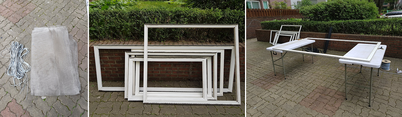 기존 방충망을 제거한 후 새로운 방충망을 부착해요. 이 집은 베란다가 햇빛을 많이 쬐여 교체한지 2년 만에 망 자체적으로 부식이 상당히 진행 됐죠. 외부에서 바람이 불면 집안으로 부식된 알루미늄 가루가 날리는 현상이 있었고 노후가 심하게 진행되어 손가락만 대면 구멍이 뚫리는 상태라 망 제거 시 어려움이 있었습니다.