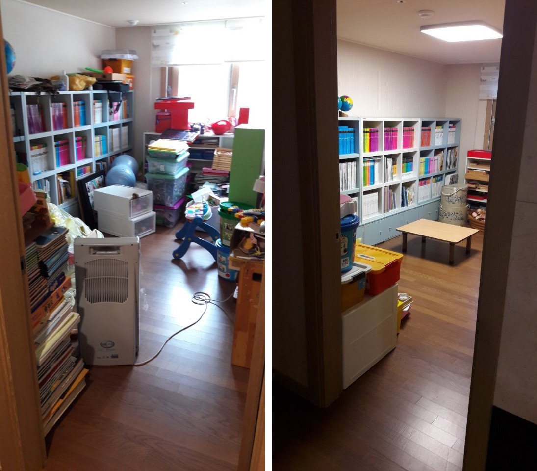 이사 입주를 위해 정리정돈을 요청하신 고객분이셨어요. 이삿짐이 이곳저곳 흩어져 있었고 가구만 배치가 완료되어 있는 상태였죠. 고객분은 유치원생과 고등학생을 자녀로 둔 4인 가구였습니다. 유치원생 아이는 2개의 방을 쓰고 있었지만 정리가 되지 않아 방의 용도가 명확하지 않았죠.