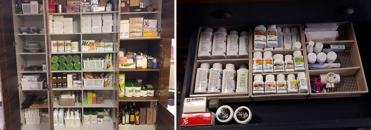 하지만 약이 무분별하게 흩어져있어서 원하는 제품을 찾기가 어려웠죠. 고수님께서는 제품의 사용빈도를 기준으로 팬트리 내의 위치를 정하시고, 용도를 기준으로 바구니에 물건을 분류했답니다.