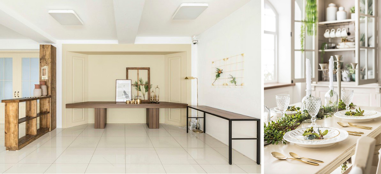 홈 파티 컨셉을 위해서 가정용 식탁을 배치하였습니다. 기존에 없던 선반을 들여와서 식기류와 유리잔으로 채웠죠. 유럽풍의 어울리는 소품을 직접 공수해오셔서 완성하셨답니다.