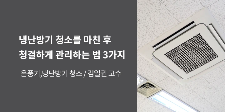 온풍기/냉난방기 전문가분들은 기관지와 피부를 위협하는 냉난방기 청소를 가정은 2년에 1번씩, 사무실 혹은 상가는 1년에 1번씩 청소하기를 권장합니다. 하지만 청소를 요청한 사람들의 고민은 사후 관리이죠. 청소야 맡기면 그만이지만 청소가 끝나고 난 후 어떻게 관리해야 할지 모르셔서 도돌이표가 되는 것이 아닐까 하고 우려를 하는 분들이 많아요.