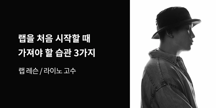 '쇼미 더 머니 6'와 '쇼미 더 머니 7'에 참가자로 출연한 라이노 고수님은 수강생의 수준에 맞춘 랩 레슨을 시작했습니다. 라이노 고수님께서는 17살 때부터 가사를 쓰며 랩을 시작하셨죠. 이후 숱한 오디션의 경험과 커다란 무대의 경험을 바탕으로 체득한 랩을 시작할 때 가져야 할 습관 3가지를 알려주셨답니다.