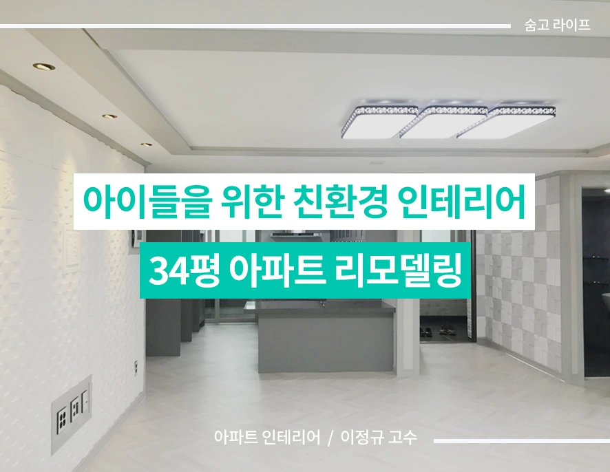 부부께서는 아이들의 호흡기 질환과 아토피 등의 피부질환을 방지하고자 친환경 소재로 아파트 리모델링을 요청해 주셨어요. 거주하신지 3년이 넘은 아파트였지만 아이들의 성장을 위해 이사가 아닌 리모델링을 선택하셨죠.