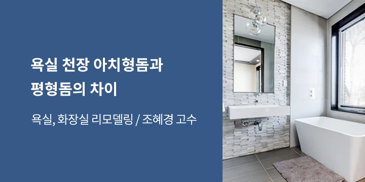숨고의 욕실/화장실 리모델링 조혜경 고수님께서는 다양한 요소 중에서 욕실 천장에 대해서 설명해주셨답니다. 욕실 천장은 들리도록 제작이 되어있는 돔이 설치되어 있어요. 고수님께서는 대표적인 욕실 돔인 아치형돔과 평형돔의 차이와 시공에 사용되는 천장재에 대해서 설명해주셨답니다.
