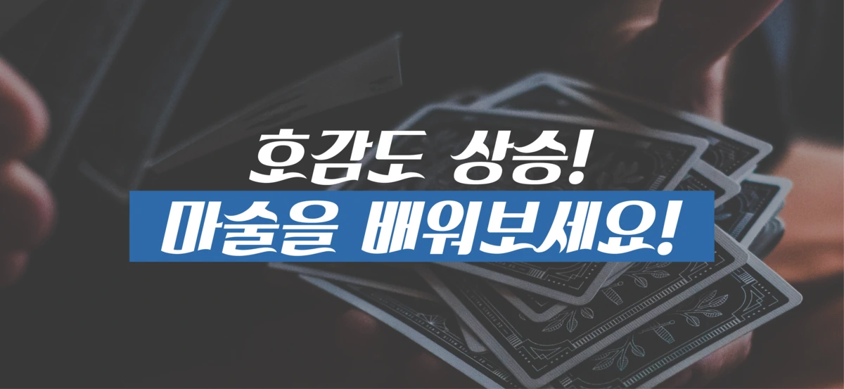 크고 화려한 마술을 하는 전문가가 아니더라도 짧은 시간동안 투자해서 배울수 있는 간단한 마술들은 무궁무진하다구요! 썸녀에게 호감을 사기위한! 여자친구를 즐겁게 할! 센스있는 마술들로 썸녀 공략! 여자친구 공략! 성공할수 있답니다~ 지금 마술레슨 시작해보세요!