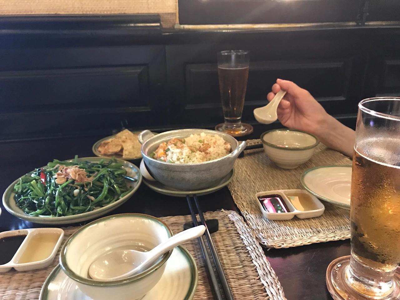 브레이크 타임에 예약을 하고 저녁 오픈에 맞춰 입장했더니, 풍경이 좋은 곳으로 앉을 수 있었다. 모닝글로리, 해산물 볶음밥 등을 주문했다. 4개의 도시 , 매 끼니에 모닝글로리를 먹었는데 이 곳이 가장 깔끔하고 담백했으며 풍미가 좋았다. 저녁을 먹는 동안, 어둠이 내려앉았다.