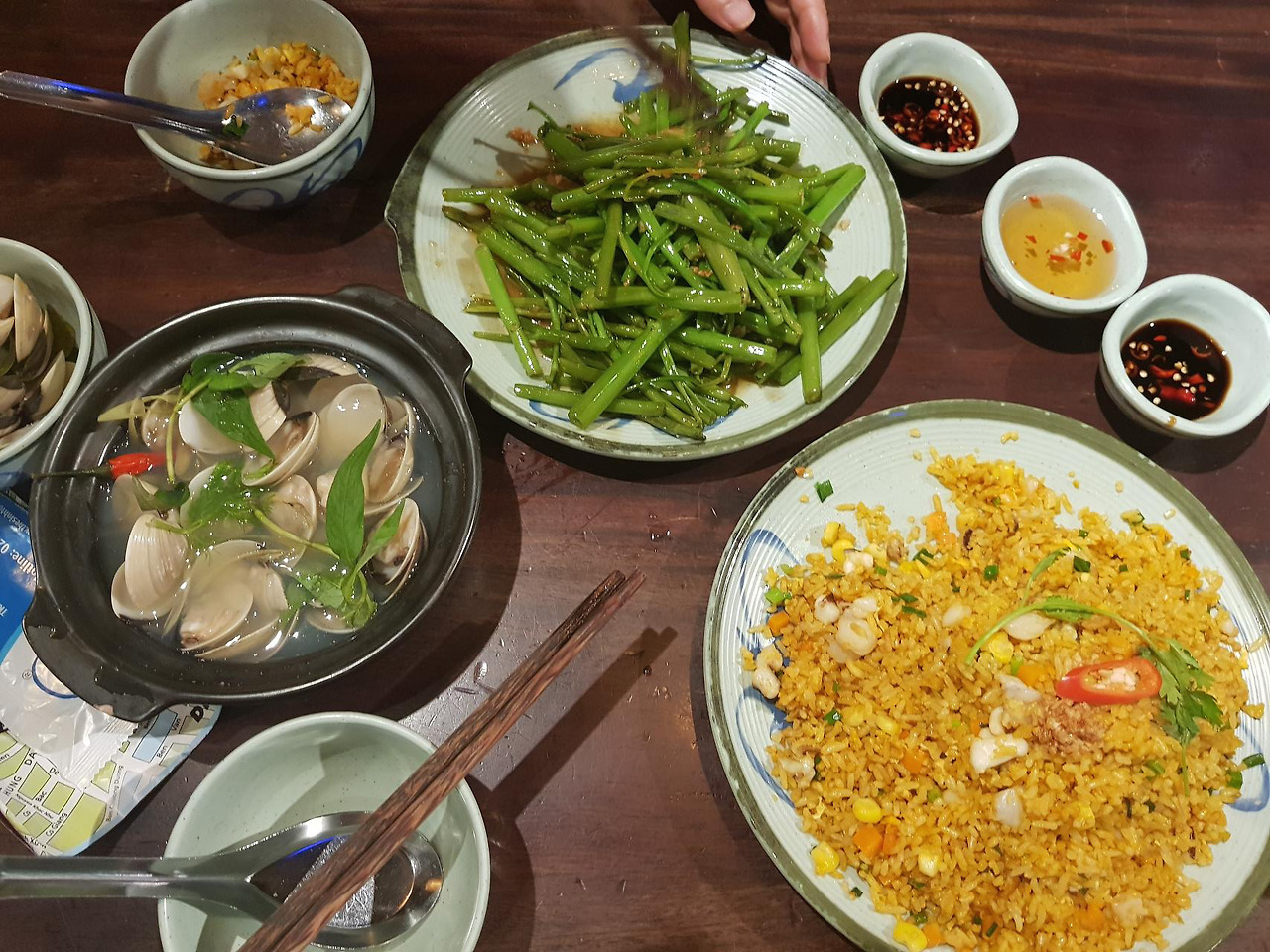 푸드코트로 저녁을 먹으러 이동하는 길에 괜찮은 로컬 커피가 있어서 들어갔다. Thuc coffee로, 나중에 구글 맵으로 보니 지점이 제법 있는 곳이었다. 안정된 분위기가 느껴지는 곳으로 커피 맛도 무난했다. 사이공 몰로 들어가 푸트코트로 향한다. 다양한 음식점들 중에 한식을 파는 곳들이 눈에 띈다. 그럼에도 모닝글로리 먹어야 하니까 37 street란 곳에서 조개탕,해산물밥 그리고 모닝글로리 주문해서 만족스럽게 식사했다. 다음날도 여기서 한 끼를 해결했는데, 맛도 좋았고 깔끔해서 아주 느긋하게 식사를 마쳤다.
