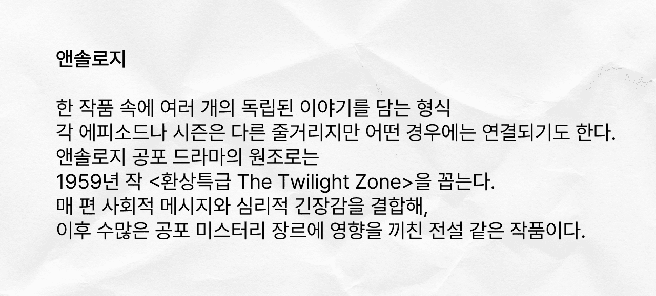 앞서 기묘상점에서는 괴담이나 도시전설처럼 허구와 현실 사이를 오가는 콘텐츠를 소개해 왔다. 이번에는 드라마다. 몇 해 전, 늦은 밤이면 홀린 듯이 찾아보던 미드가 있었다. 호러 장르라고는 하지만 무섭기만 한 건 아니었다. 시즌마다 새로운 이야기를 이어 가며 특유의 매력으로 메시지를 전달하는 〈American Horror Story〉가 그 주인공이다. (이하 '아호스')