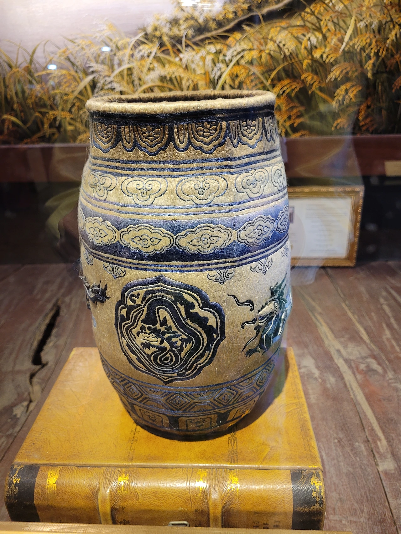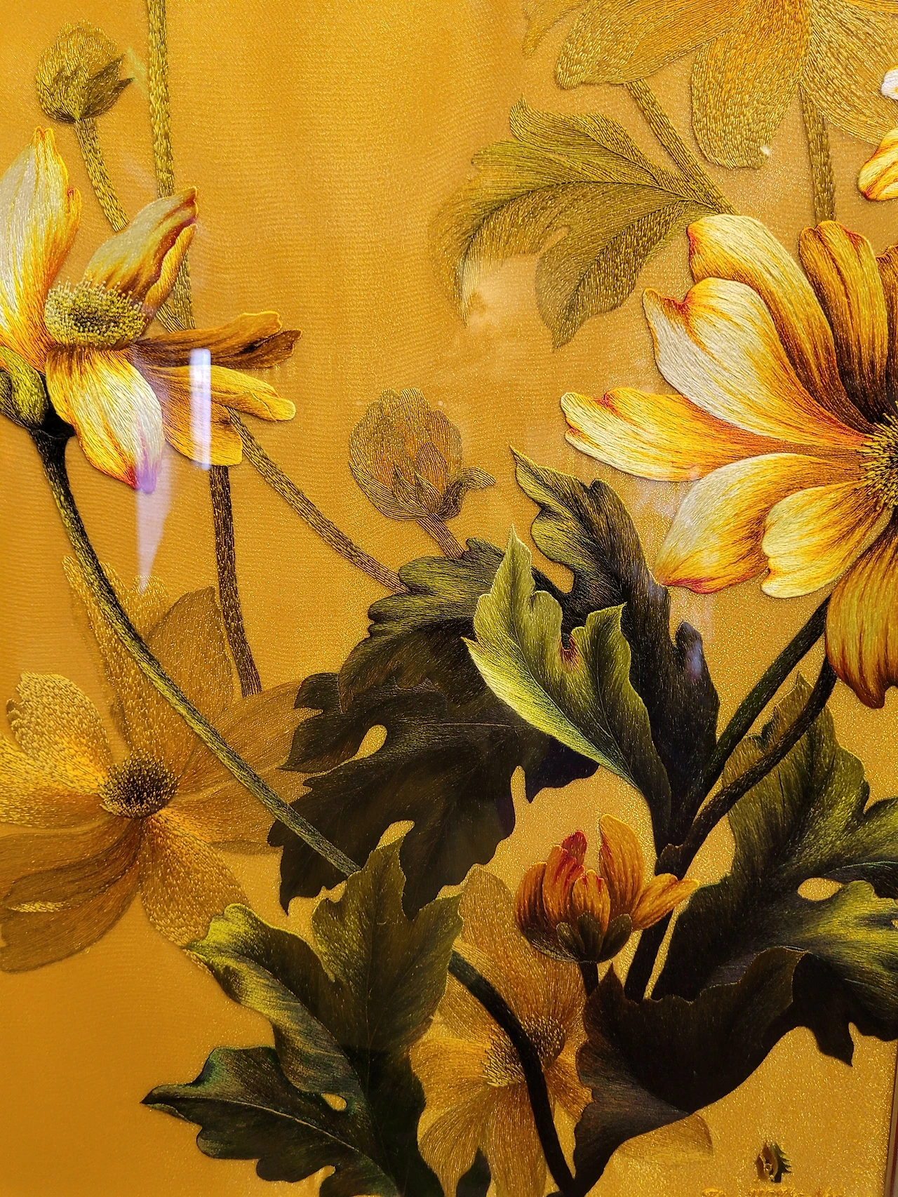 들어서는 입구에 내 눈을 끄는 색감의 도자기가 진열되어 있었다. 자수박물관에 웬 도자기인가 하고 가만히 들여다보니 일일이 수를 놓은 자수 작품이었다. 내가 잘못 본 게 아닌가 싶어 보고, 또 들여다봐도 도자기 같은 자수였다. 헛웃음마저 나오려는 것을 겨우 삼켰다.