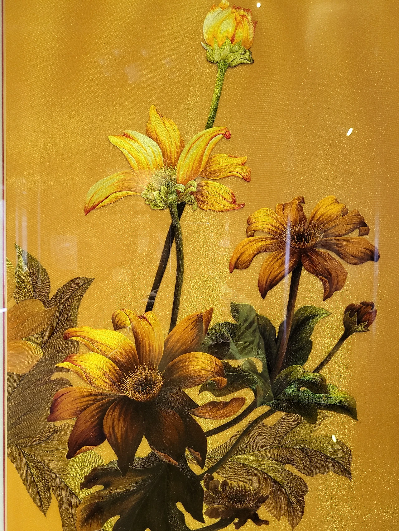 자수라고 해서 내가 익히 알고 있는 정도의 것일 거라 생각했는데 그것을 보기 좋게 비웃는 수준 높은 작품들이었다. 대나무, 연꽃, 호랑이 등을 지나치게 원색으로 표현한 부담스러운 것들을 빼더라도 몇몇 손에 꼽히는 작품은 한동안 그 앞에서 자리를 뜨지 못하게 했다.