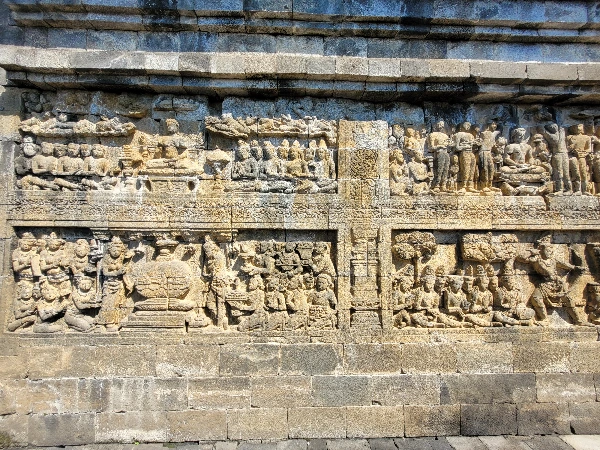 층층별로 불교의 3계를 표현하고 있는데 미안하게도 자꾸 앙코르와트가 생각난다. 훨씬 더 정교한 앙코르와트의 현란한 조각들이 눈앞에 어른거린다. 자식도 비교하면 안 되는데 국가의 문화유산을 견주었던 내 맘을 들키지 않으려고 마른침만 꿀떡 삼켰다.