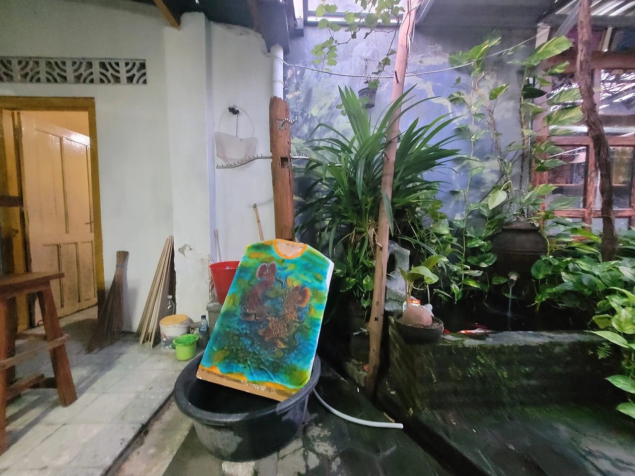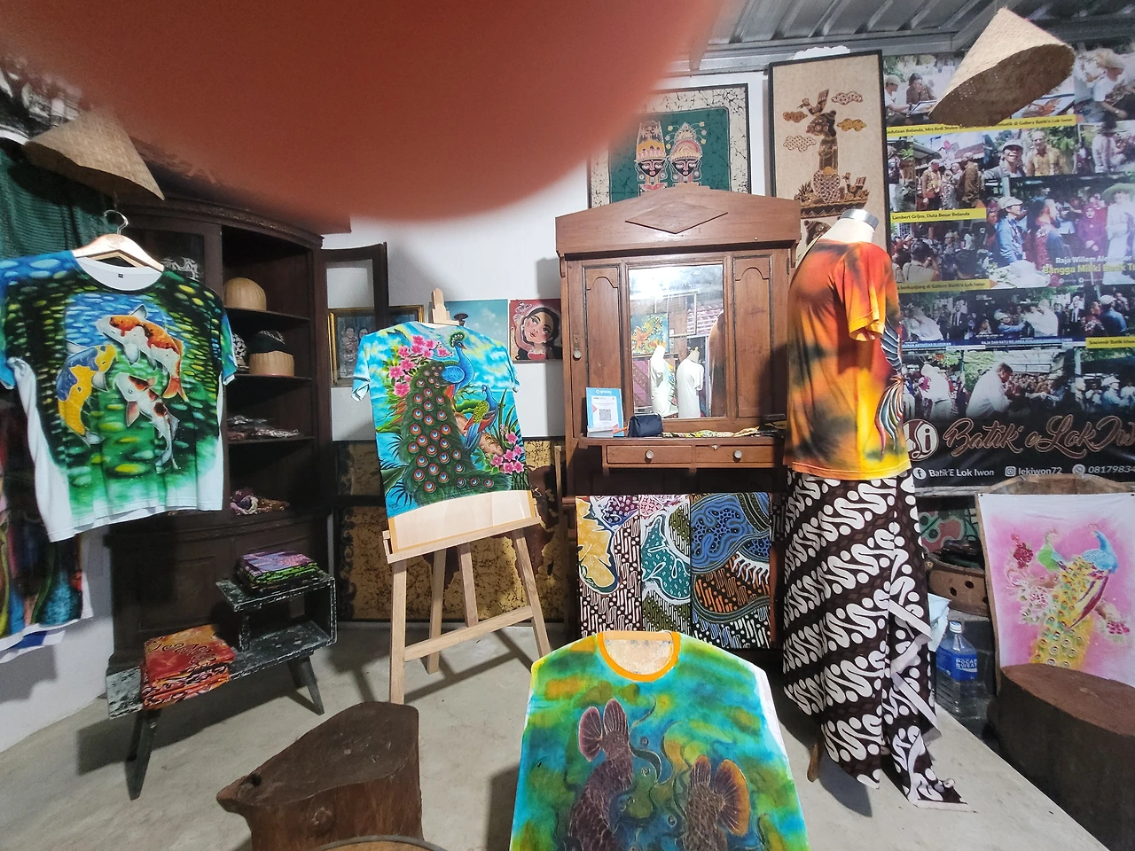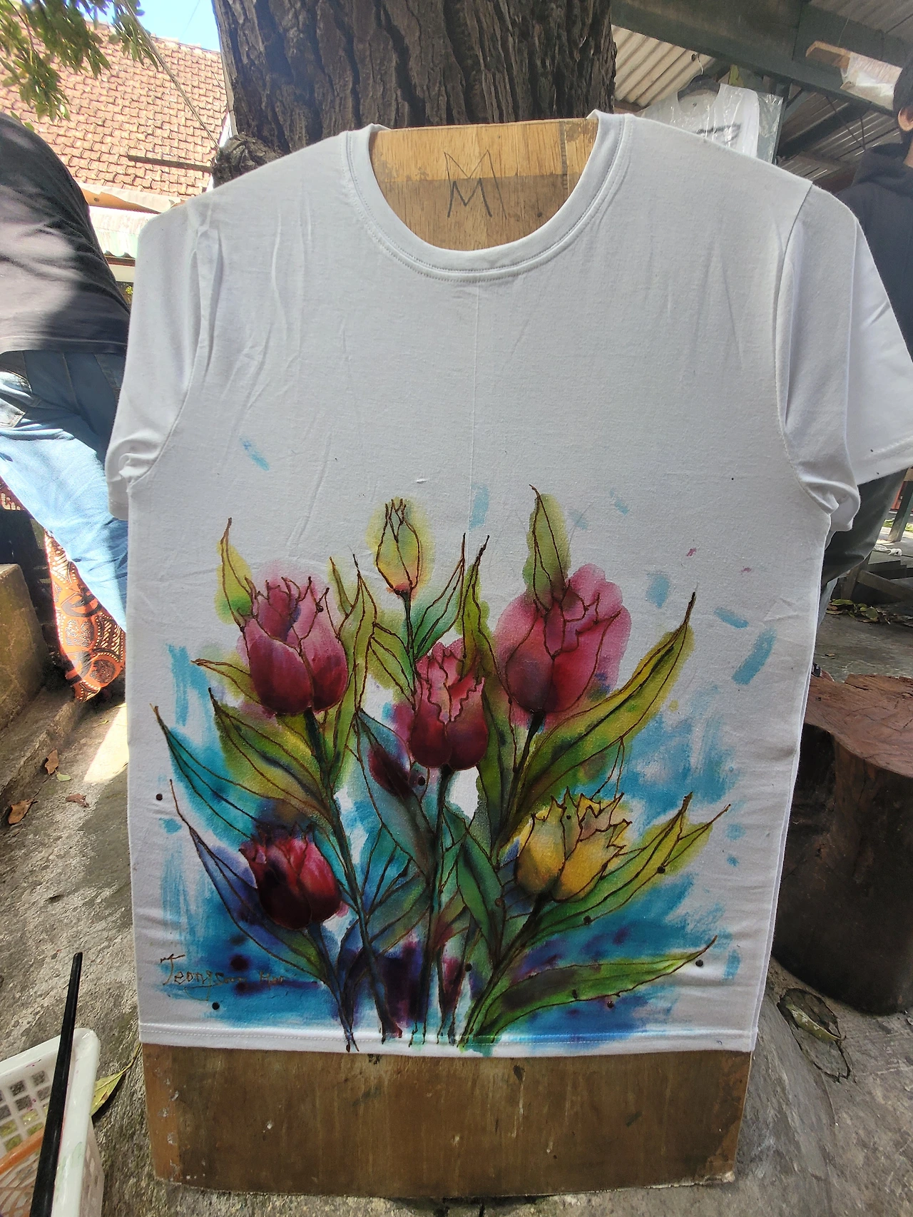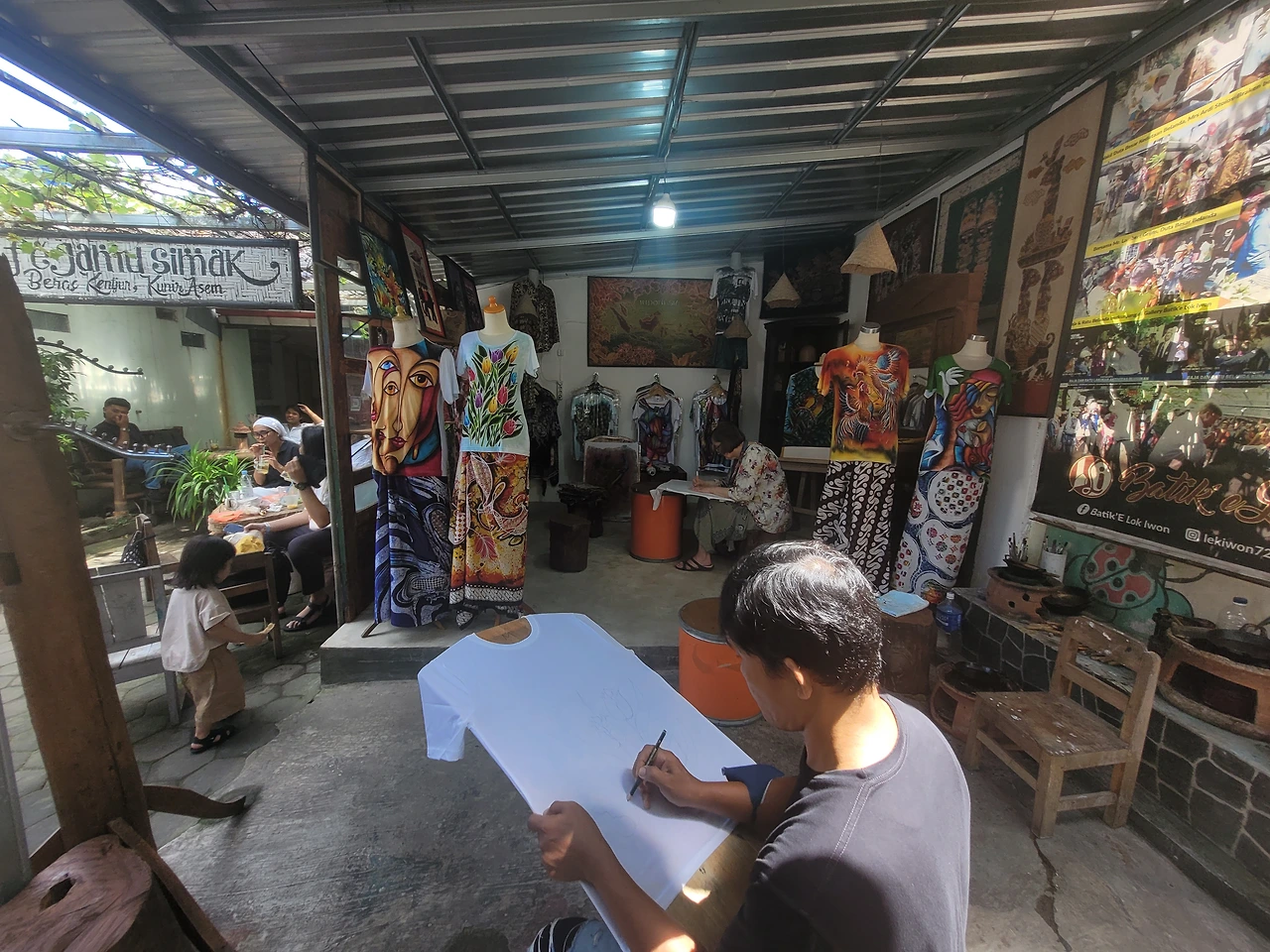 그가 나를 마지막으로 데려간 곳은 따만사리 안에 늘어서 있는 가옥들 초입에 있는 바틱 가게였다. 그곳에서는 바틱을 실제 그려볼 수 있다. 250,000루피아를 내면 흰색 티셔츠에 본인이 원하는 문양을 그린 후 가져갈 수 있다.