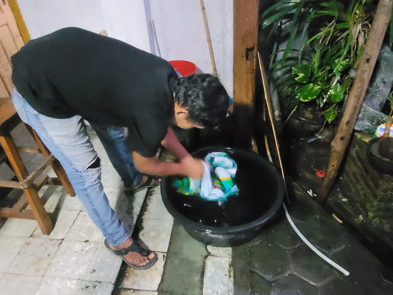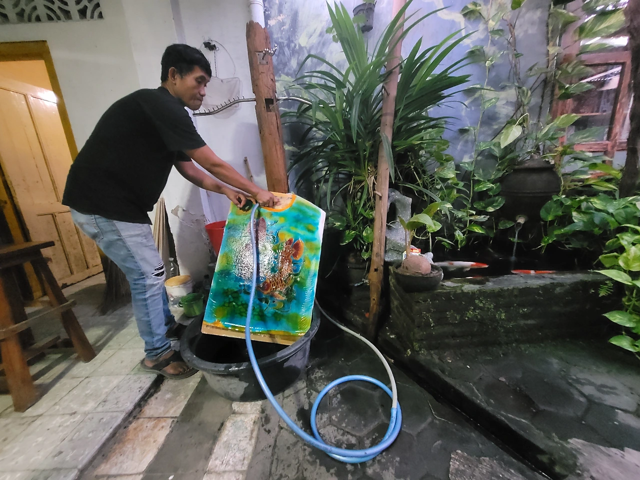 500,000루피아인데 티셔츠 수강도 한 터라 50,000루피아를 깎아준다. 부피 때문에 액자는 분리하고 원단에 묻은 먼지 때문에 다시 세척해서 다려주었다