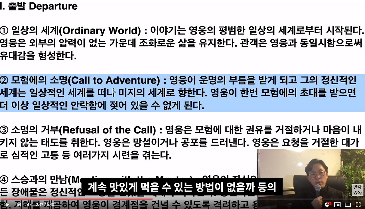 영상에서는 미처 얘기를 못 드렸는데요. 12단계 플롯에 맞추어서 브랜드의 스토리를 만드시는 겁니다. 보통의 경우 창업주의 창업 이야기에서 발현되는 경우가 많은데요. 이와 같은 플롯을 활용하면 브랜드 스토리가 지루하지 않고 한 편의 영화나 드라마를 보는 것처럼 흥미진진하게 느끼게 됩니다. 우리 브랜드에 대해서 더욱 관심이 가게 되는 거죠.