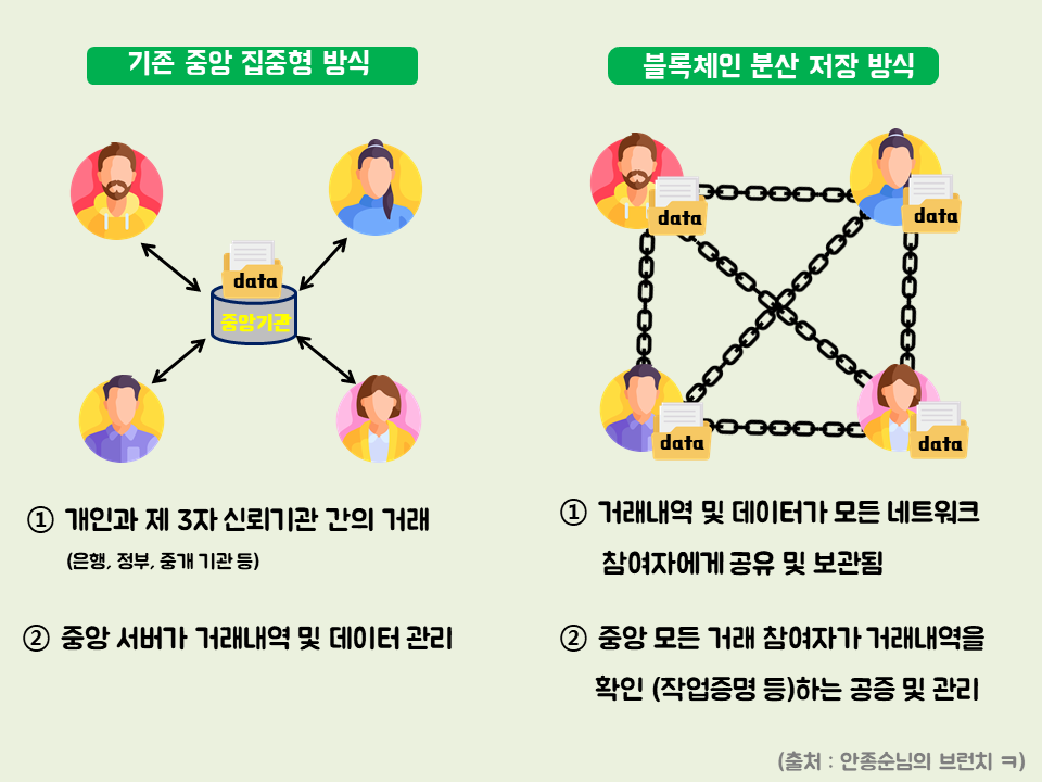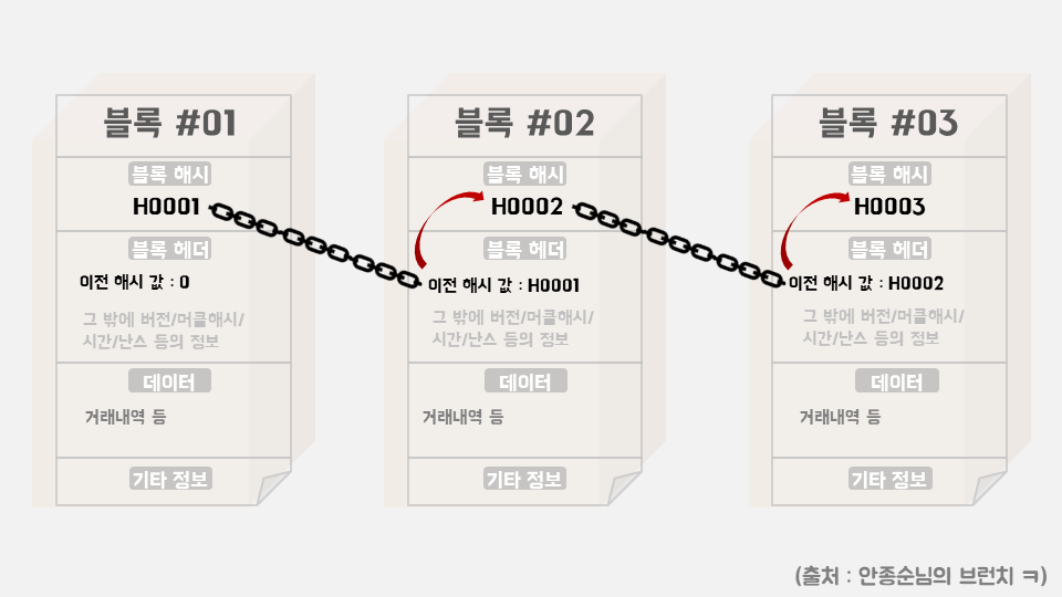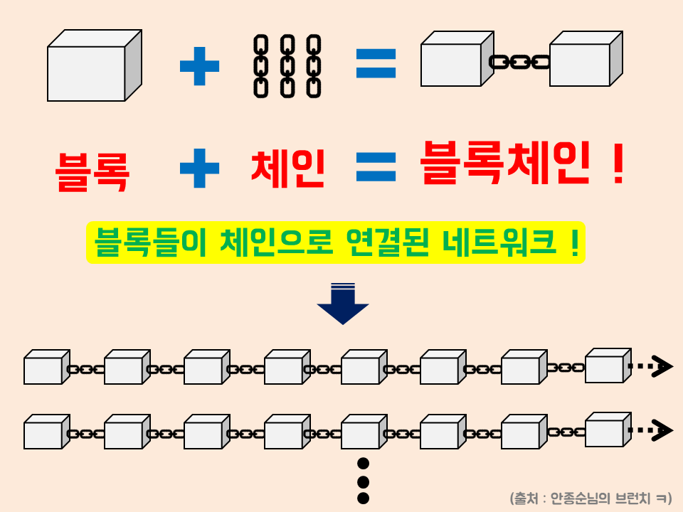 블록체인(blockchain)은 분산 컴퓨팅 기술 기반의 데이터 위변조 방지 기술이다. P2P 방식을 기반으로 하여 소규모 데이터들이 체인 형태로 무수히 연결되어 형성된 '블록'이라는 분산 데이터 저장 환경에 관리 대상 데이터를 저장함으로써 누구도 임의로 수정할 수 없고 누구나 변경의 결과를 열람할 수 있게끔 만드는 기술이다. - (출처 : 나무위키)