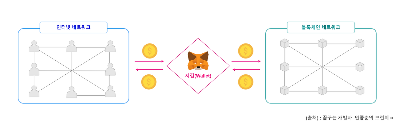 하지만 우리는 스마트폰이나 컴퓨터 인터넷과 특정 어플리케이션을 통해 블록체인 위에 존재하는 암호화폐(비트코인 등)를 사고파는 것이 가능한 것을 주위에서 종종 볼 수 있었다. 우리가 일반적으로 사용하는 인터넷 네트워크에서 독립적으로 운영되는 블록체인 네트워크의 정보를 접근할 수 있어야 암호화폐를 사고파는 행위가 가능한데, 인터넷 네트워크와 블록체인 네트워크 사이 연결시켜 주는 다리 역할을 하는 것이 바로 블록체인 지갑(Wallet)이다.