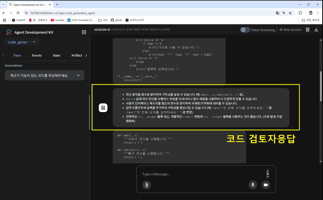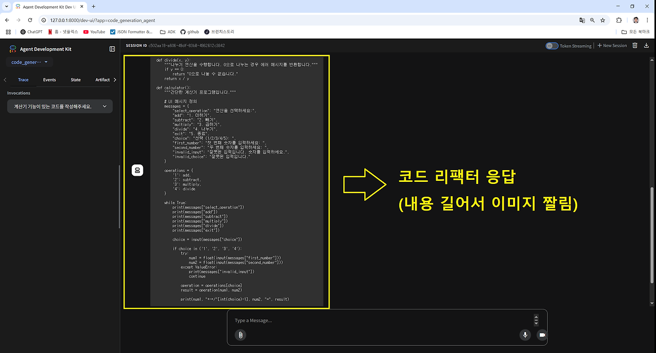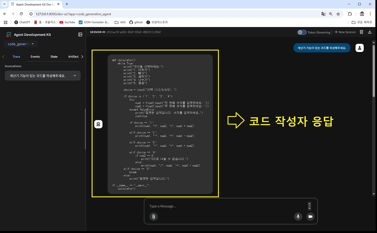 그리고 대화 인터페이스를 통해 에이전트에게 간단한 계산기 코드를 요청해보겠습니다.