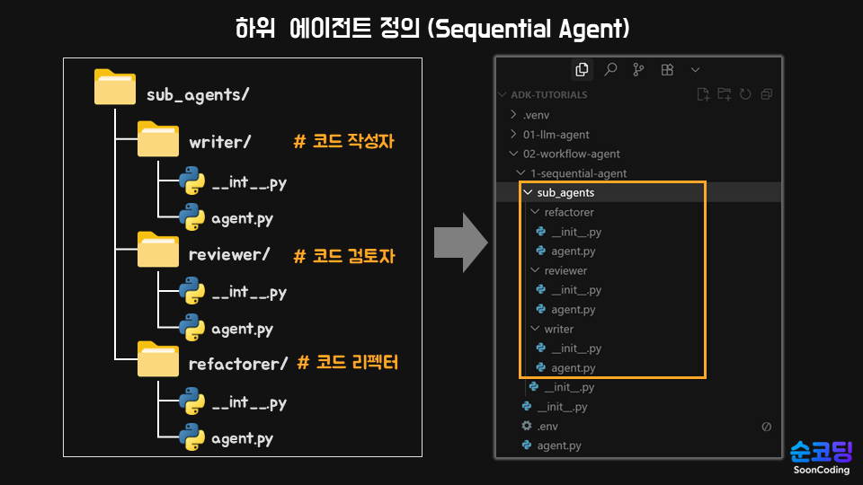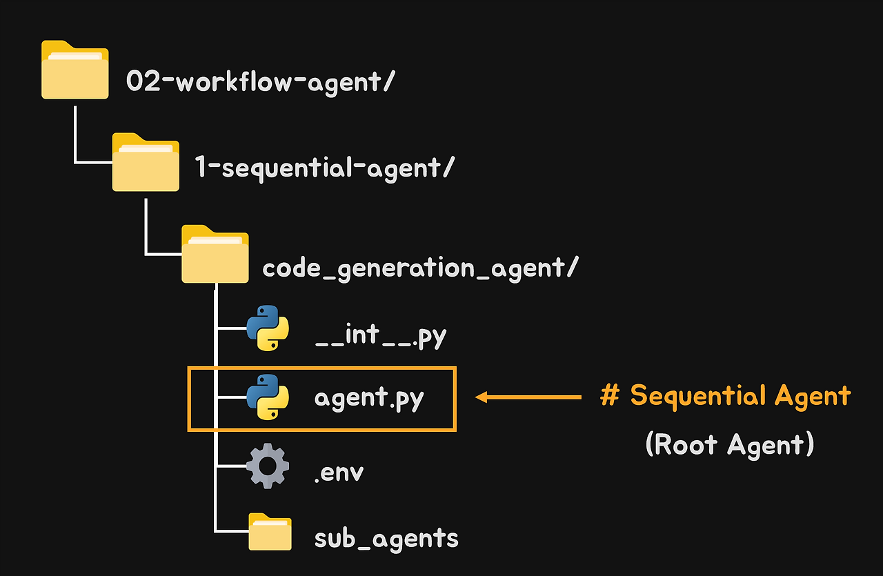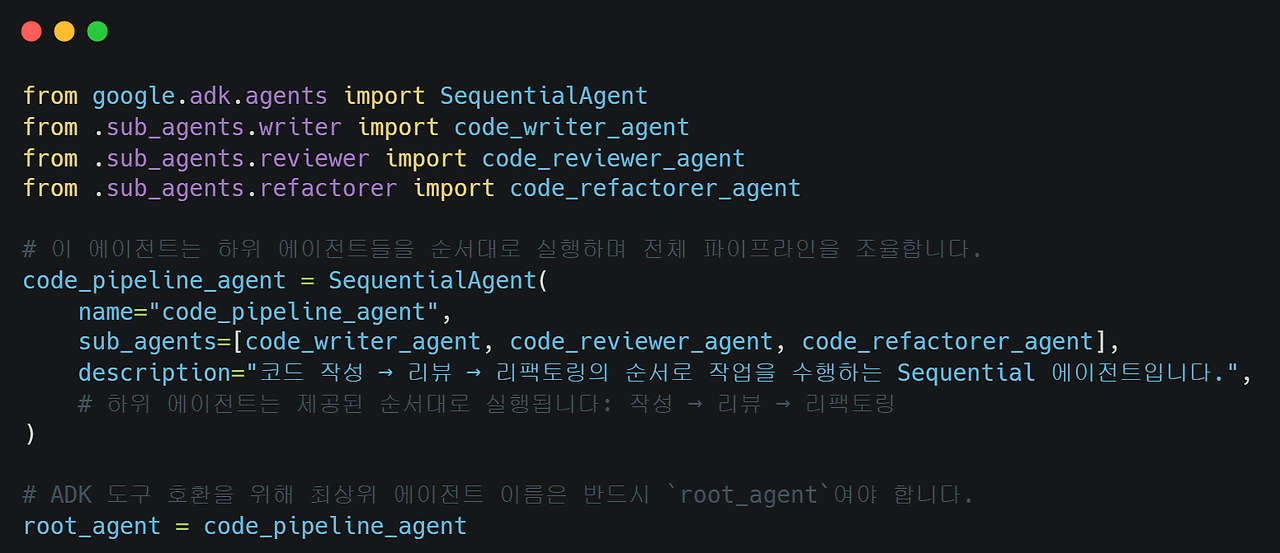 여기에서 루트에이전트는 전체 작업 흐름을 순차적으로 제어하는 SequentialAgent가 될 겁니다.