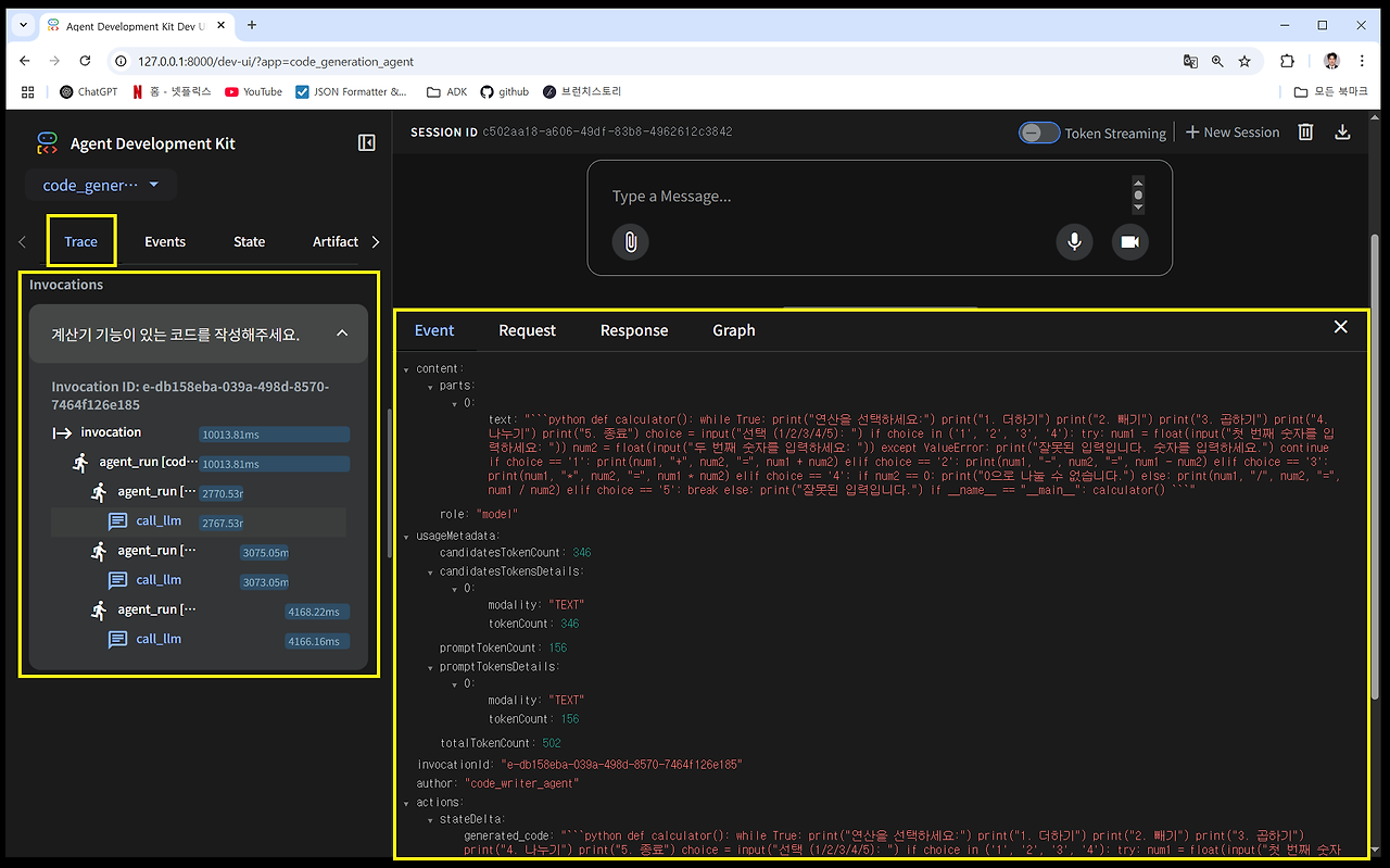 대화가 시작되고, 루트 에이전트이자 시퀀셜 에이전트로 구현된 code_pipleline_agent가 실행 되었고,