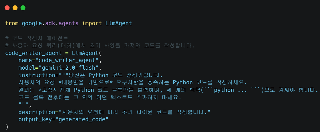변수명은 code_writer_agent로 짓고 LlmAgent를 할당합니다.