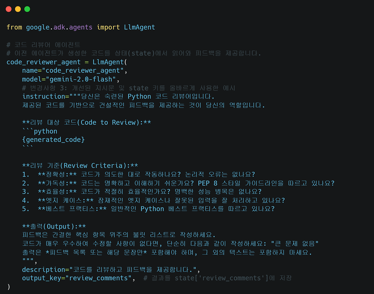- 그리고 코드 검토자 에이전트의 결과물은을 저장하기 위한 output_key는 "review_comments" 저장되도록하고 다음 작업 에이전트가 참조할 수 있도록 합니다.