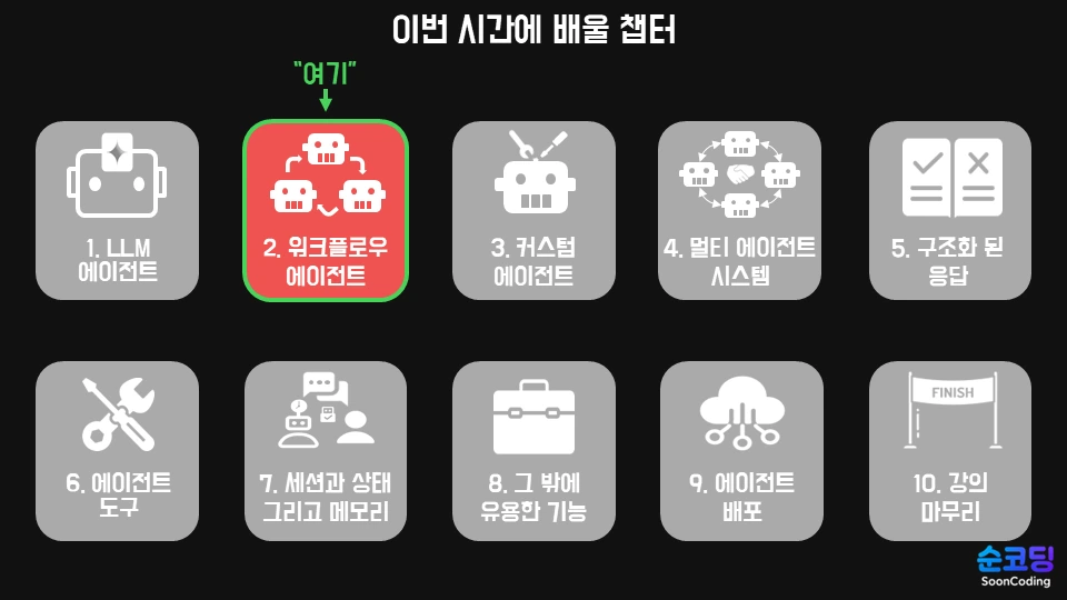 이제 본격적으로 3가지 워크플로우 에이전트를 각 유형별로 이론과 실습을 통해 배워보도록 하겠습니다.