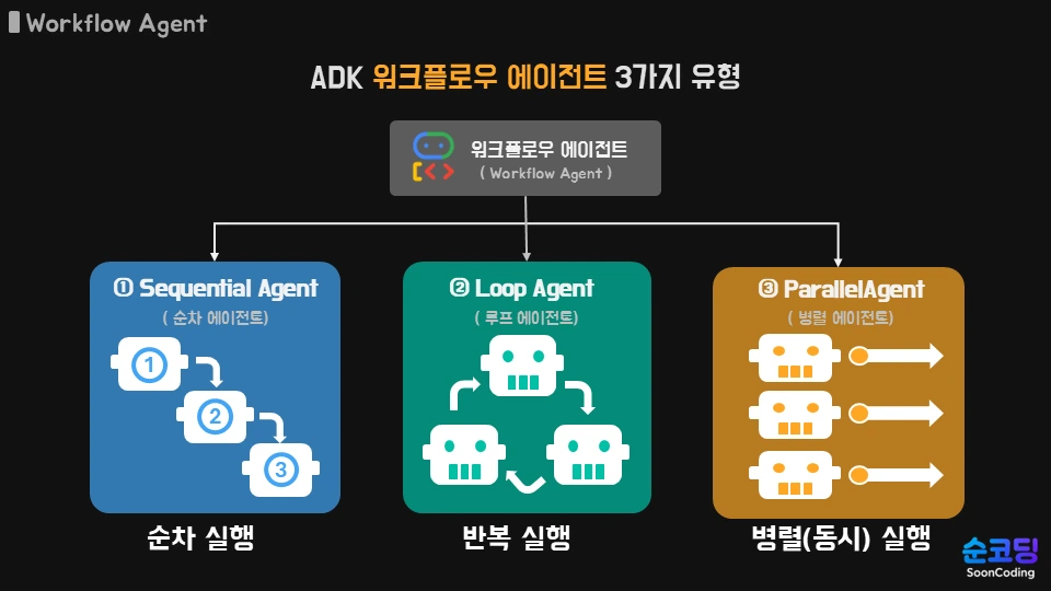 Google ADK에서는 다음과 같은 세 가지 워크플로우 에이전트를 제공합니다