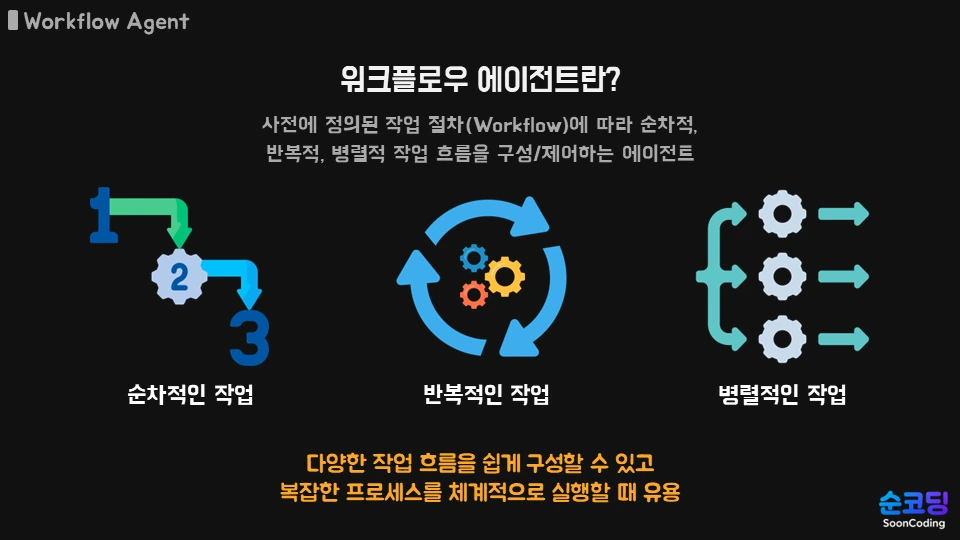 이처럼 다양한 작업 유형과 흐름을 쉽게 구성하고 제어할 수 있도록 돕는 것이 바로 '워크플로우 에이전트' 입니다.