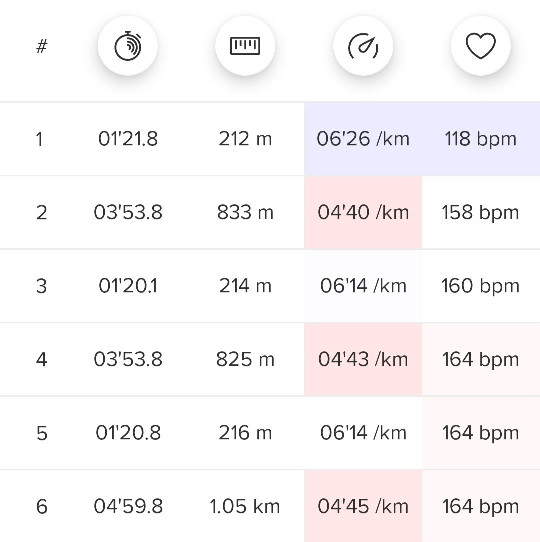 1, 2세트는 경쾌했다. 그런데 3세트에서 “힘들어!” 바짝 내 뒤를 쫓아서 달리던 핑크팬더가 지치고 말았다. 내 리딩 페이스가 빨랐나 보다. 핑크팬더가 잘 쫓아와서 나도 신이 나서 페이스를 계속 밀고 말았다. 구간 페이스를 체크해 보니 800m를 440~445 페이스였다. 핑크팬더가 열심히 잘 쫓아왔지만 분명 힘들어할 페이스였다. 결국 3세트에서 멈춘다. 5세트는 다음에 해보기로 기약하고 마무리로 3km 조깅을 하고 핑크팬더는 러닝을 마친다.