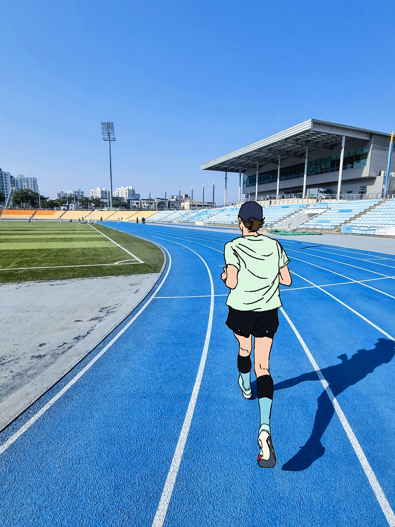 우리는 서둘러 몸을 풀고 트랙을 두 바퀴 정도 조깅으로 돌고 난 뒤, 본격 훈련 800m/200m 인터벌 러닝을 시작했다. 목표는 5세트, 총 5km였다. 경쾌하게 하종운 트랙을 달리기 시작했다.