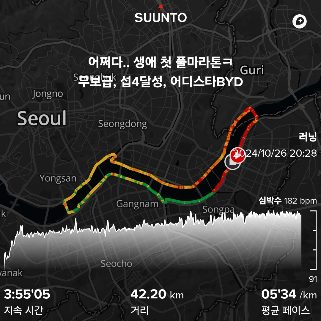 그리고 지난해 가을 나 홀로 비공식 42.195km 풀마라톤을 3시간 55분대로 뛰다 보니 어쩌다 운 좋게 완주했다.