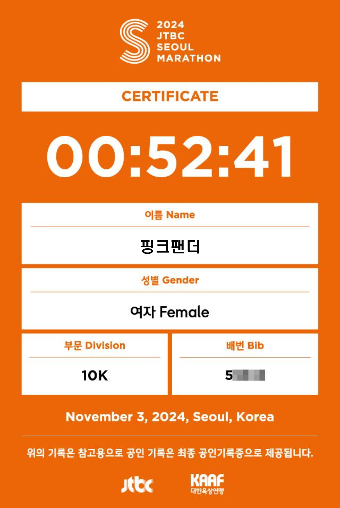 핑크팬더는 지난해 2024년 6월에 본격(?) 러닝을 시작했다. 5~6km를 7분대 페이스로 뛰던 런린이였지만 우리 러닝크루에서 부지런히 달리며 일취월장해 2024 JTBC마라톤 10km 부문에서 52분대로 뛰었다. 비공식이지만 20km 조깅도 몇 차례 뛸 수 있는 체력도 만들었다.