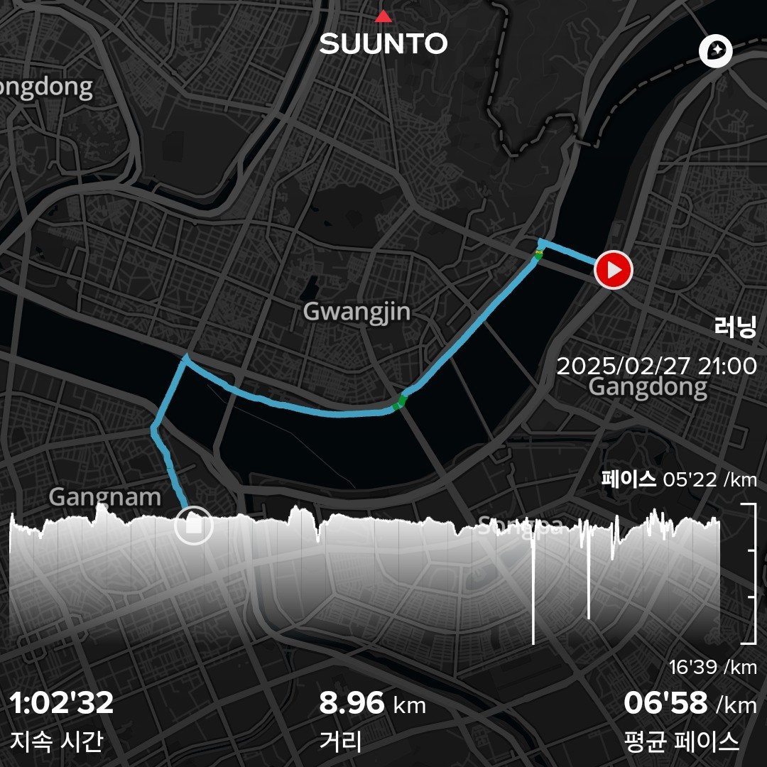그녀의 무릎통증을 생각해 더 천천히 뛰었고, 총 16km를 달렸다. 비록 느렸지만 이번엔 평소의 핑크팬더처럼 뛰었다. 뛰는 리듬과 호흡/심박도 안정적이었다. 중간에는 핑크팬더 스스로 짧게 힘껏 뛰어보기도 했다.