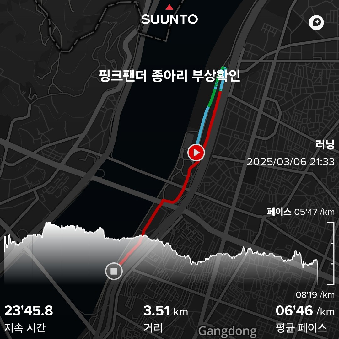 이때 핑크팬더의 말을 깊게 받아들이지 않았다. 일단 뛰기로 했으니까.. 훈련 욕심이 먼저였던 것 같다. 스트레칭을 마치고 조깅을 했는데.. 조깅을 하자마자 이내 곧 종아리에서 불편함을 느끼는 핑크팬더, '오늘은 인터벌을 무리겠다.' 싶어 가볍게 조깅을 이어갔지만 종아리 불편함에 핑크팬더는 멈추고 말았다. 4km를 못 채우고 마무리했다. 핑크팬더도 나도 서로의 얼굴색이 좋지 않았다. 특히 내가..