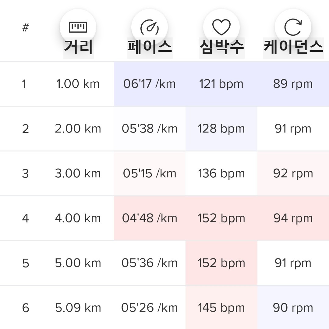첫 1km는 617 페이스**로 가볍게 웜업, 몸풀기를 한다. 2km 구간은 538 페이스로 페이스를 당기고 3km 구간부터 515 페이스로 본격 고심박영역에 올라간다.