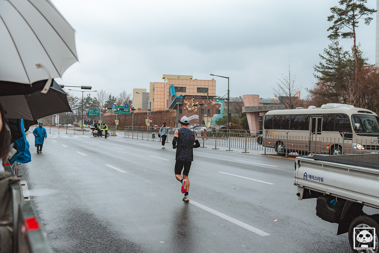 나는 운 좋게 결승점에 가장 가까운 곳에 자리를 잡을 수 있었다. 여기서 비 속을 달리는 핑크팬더를 기다린다. 우리가 예상한 기록은 55~58분으로 향후 50여 분간 이 한자리에서 망부석처럼 서있는다. 잠시라도 자리를 비키면 금세 이 자리는 사라질 생각에.. 묵묵히 자리를 지킨다. 내 옆과 뒤에는 어느덧 나처럼 멋지게 완주하고 돌아올 러너를 기다리는 연인, 가족, 친구, 동료들로 붐비기 시작했다.