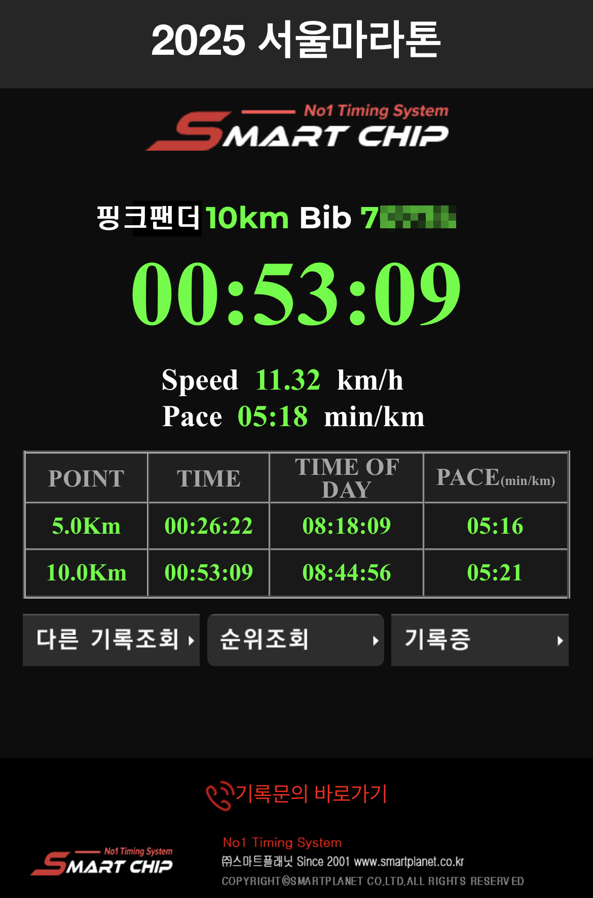 이제 가장 중요한 기록에 대한 이야기를 해보자. 핑크팬더의 서울마라톤 10km 기록은 53분 09초, 518 페이스였다. 와~ 너무 잘 뛴 게 아닌가? 예상기록을 훌쩍 상회한 기록이었다. 나는 한참을 좋아했다. 핑크팬더는 자신보다 더 기뻐하는 내가 웃겼다고 했다.