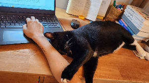 2023년 8월 13일 까만 아기고양이 한 마리를 집으로 들였다. 동네 산책을 하는데 사람 소리에 놀랐는지 새까만 것이 후다닥 자동차 바퀴뒤로 몸을 숨겼다. 그즈음 아이들이 아파트 단지를 돌아다니는 길냥이들을 보살피기 시작했고, 그런 아이들을 쫓아 츄르를 사다 나르면서 나도 길냥이들에게 조금씩 마음을 내어주던 때였다. 산책길에 마주치는 길냥이는 너무 흔해서 보통은 냐옹냐옹 인사만 나누고 지나가는데, 그러기엔 아이가 너무 작았다. 쭈그려 앉아 냐옹 하고 부르니 손바닥 만한 것이 고개를 슬쩍 빼고 살피더니 슬금슬금 기어 나왔다.