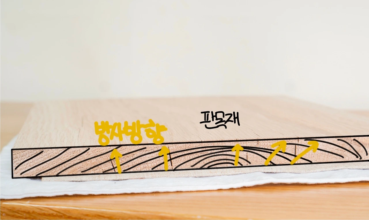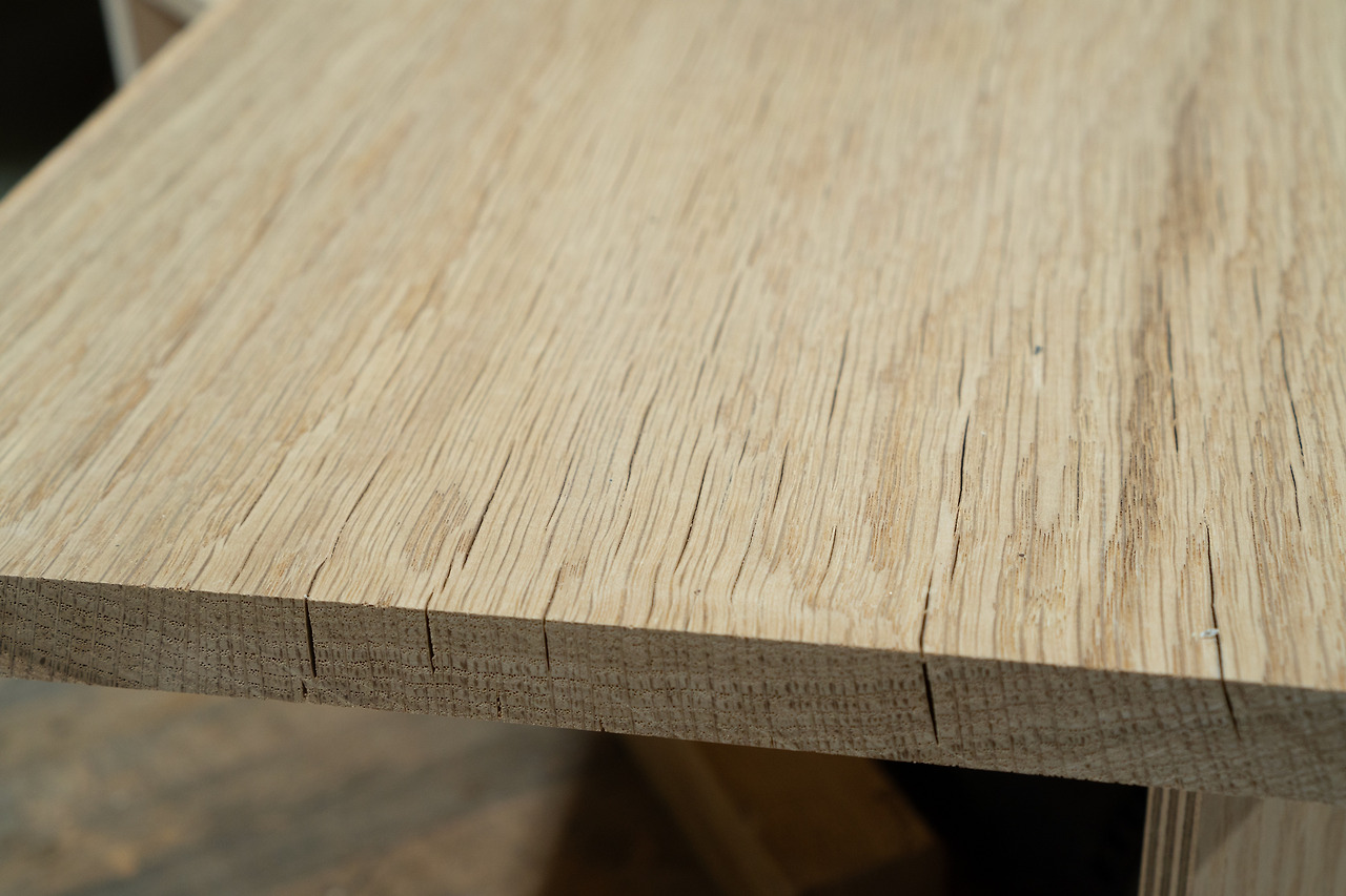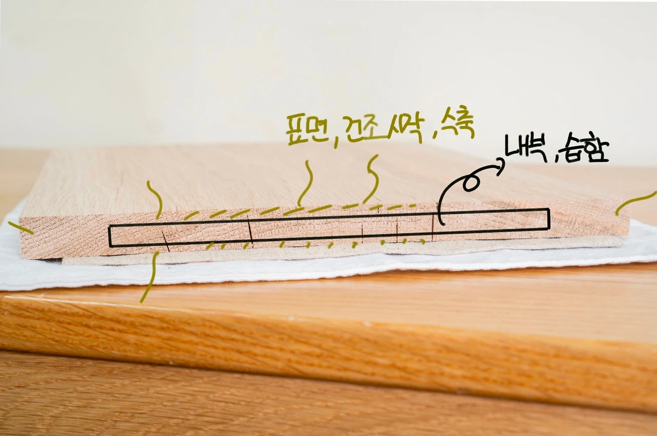 목재가 건조될 때 공기와 접하는 표면은 빠르게 건조되고, 접촉면이 적은 내부는 상대적으로 습한 상태로 남아있게 됩니다. 표면이 건조되며 수축하고, 표면과 내부 사이에 응력이 발생합니다. 이 응력이 목재 강도를 넘어서면 작은 크랙들이 생기게 됩니다.