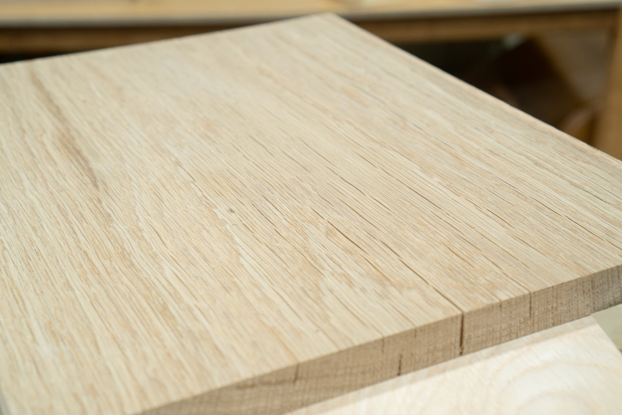 표면할렬은 참나무류 제재목에서 많이 나타나고, 판목재에서 많이 나타납니다. 판목재는 수축률이 높은 접선단면의 비중이 높은 목재이기 때문이지요. 할렬은 주로 방사방향을 따라 나타나는 걸 확인할 수 있습니다.