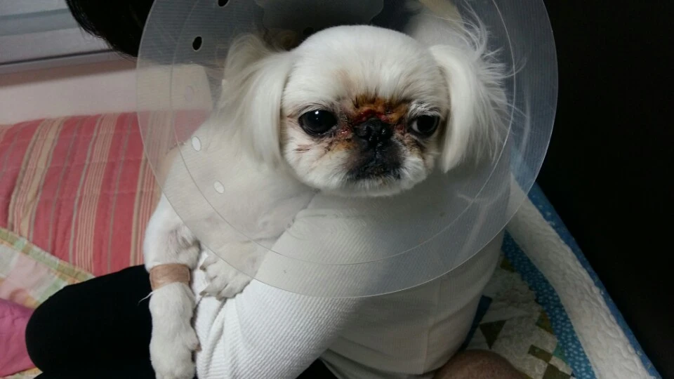 한쪽 눈은 짓물러서 눈물이 입까지 내려온 녀석...
