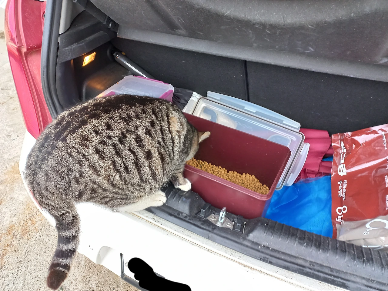 차에 실린 사료통에서 몰래 먹는다 .