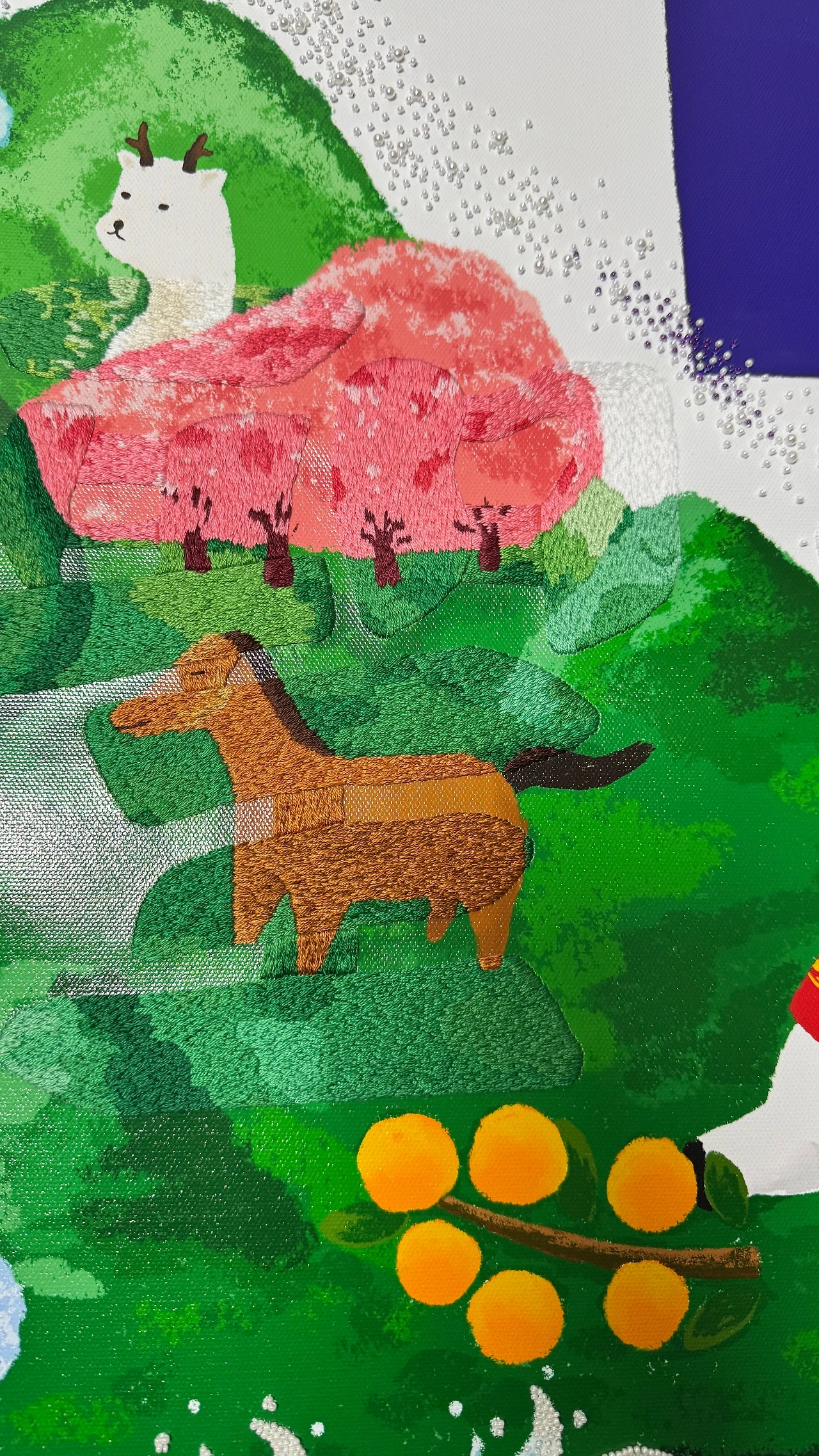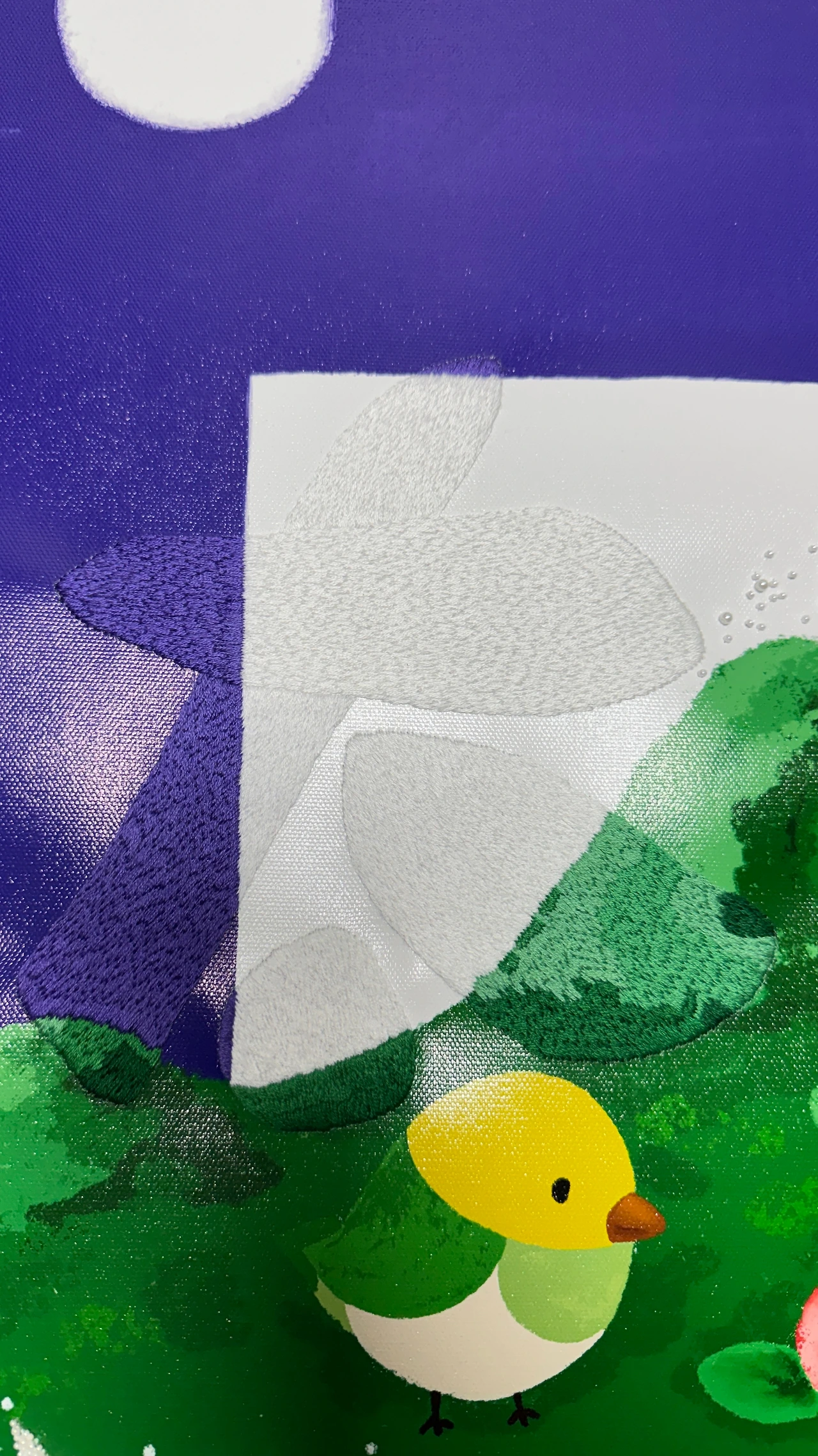 작품 가운데에 '태평성대(太平聖代)'라는 네 글자를 수놓았다. 하지만 작품을 얼핏 보아서는 이 글자들이 한눈에 드러나지 않는다. 인쇄된 바탕의 색과 완전히 동일한 색의 실을 선택했기 때문이다. 작품의 전체적인 분위기를 해치지 않기 위함이기도 하지만, 여기에는 또 다른 이유가 있다.
